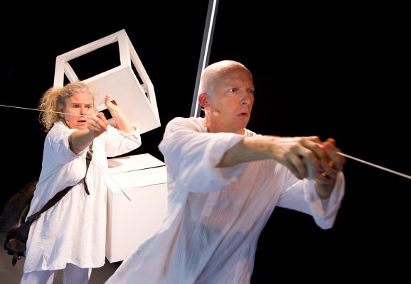 From British Theatre Guide, Rachel Nouchi: ‘I is a strange loop captures vividly the push and pull between physicality and the abstract world of numbers in a flow of mathematical speak rubbing up alongside a debate on the consciousness of life, death and mortality. A lot to digest in 100 minutes, especially if you are neither maths whiz nor science geek, but when the abstract and physical worlds clash in the form of two actors floating about in white Grecian garb posing as X and Y, the effects are funny, illuminating and often baffling. Tonight’s piece, part of a triptych created for the Barbican’s Life Rewired season, tackles what it means to be human at a time when advances in technology and scientific research are hurtling forward with unprecedented speed.’